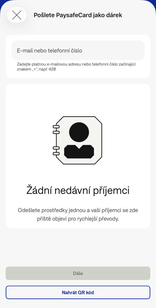 Zadejte e-mail nebo telefonní číslo příjemce, případně vyberte kontakt z historie.